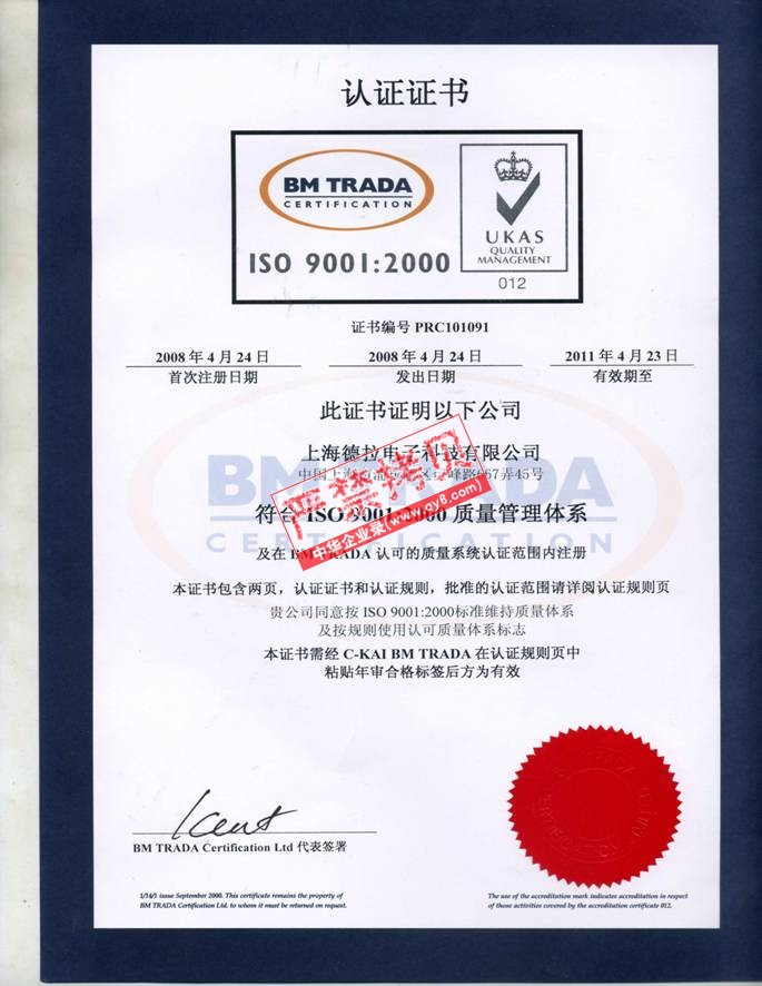 網址:shdela.qy6.com ISO 9001:2000質量管理體系資質_上海德拉電子科技有限公司